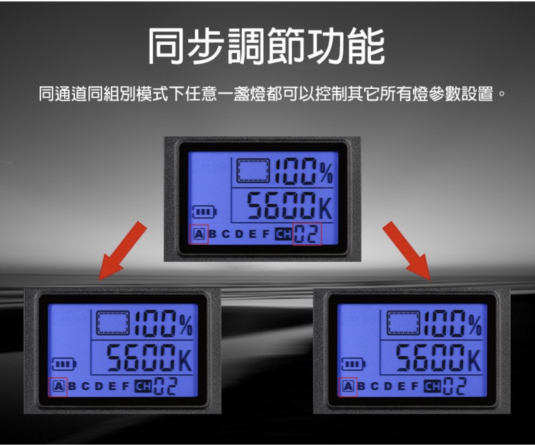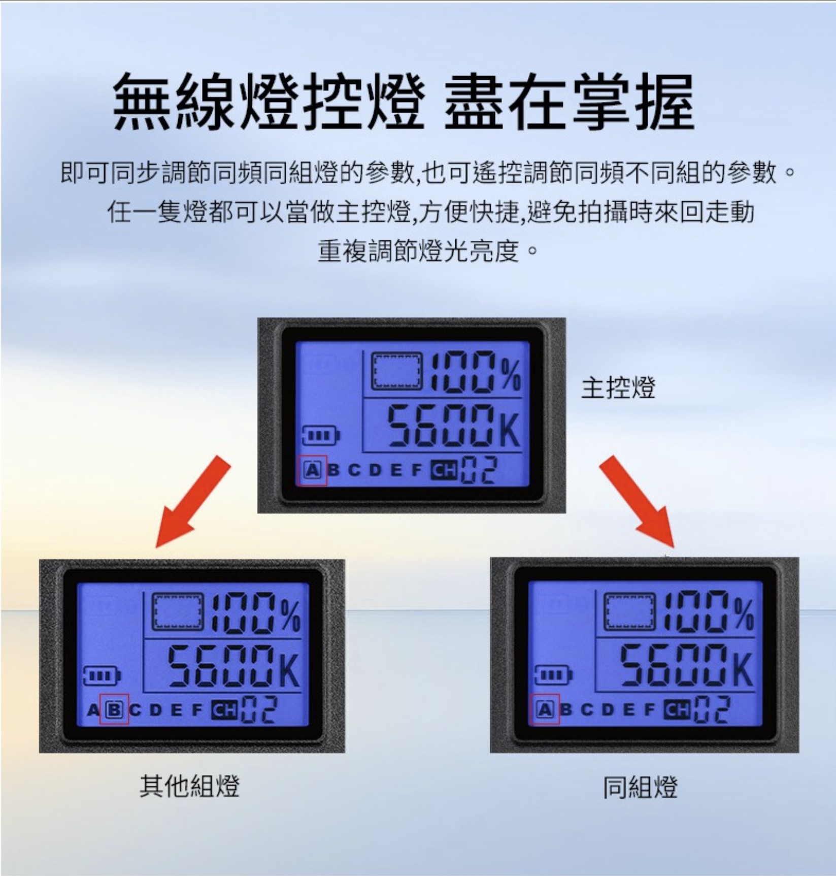 ※無須個別調整每個燈數值,可使用無線頻道、群組多組控光